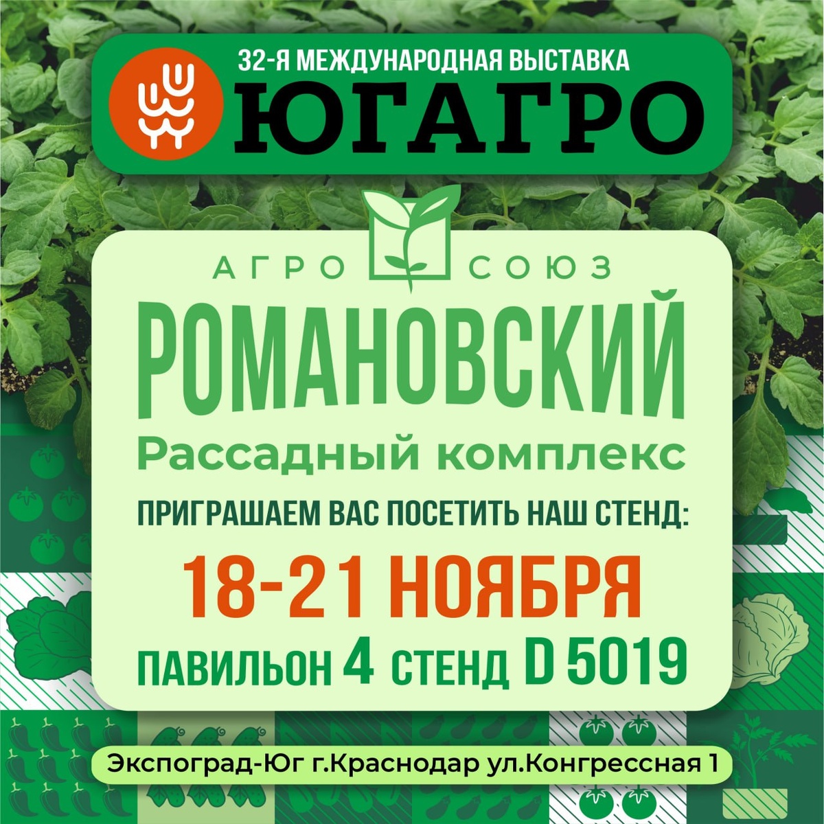 🌿 РК «Агросоюз Романовский» на «ЮгАГРО 2025»! 🗓 С 18 по 21 ноября в Краснодаре пройдёт «ЮгАГРО 2025» — крупнейшая в России международная сельскохозяйственная выставка, где собираются производители, поставщики и фермеры, чтобы обменяться опытом и найти новые решения для агробизнеса. 🌱 На нашем стенде D5019 вы сможете увидеть рассаду бахчевых и овощных культур, выращенную в рассадном комплексе «Агросоюз Романовский», в том числе c применением технологии прививки на подвой, которая позволяет выращивать более крепкие растения и получать стабильный урожай. ✅ Каждый год мы участвуем на выставке «ЮгАГРО», и множество фермеров приходят на наш стенд, чтобы познакомиться с новыми технологиями, обсудить сезон и получить лучшие и индивидуальные предложения от наших менеджеров. 📍Приглашаем вас посетить наш стенд D5019, павильон 4! ✅ Получить бесплатный билет посетителя по ссылке #югагро #югагро2025 #рассада