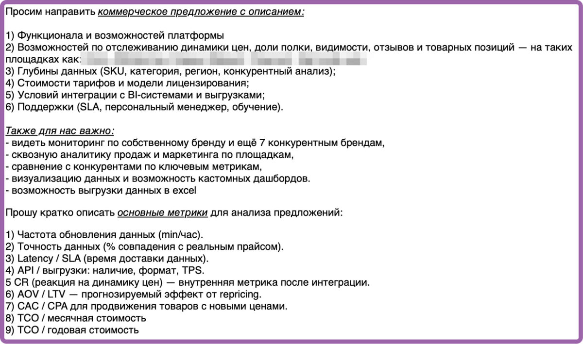 Заказ пришел на xmldatafeed.com на парсинг. На картинке, убрал лишнее... Хотя там массовая рассылка была. Показал команде - ну очень сложно. Причем даже не выделить самое сложное - все крайне не просто выглядит. Почему? Парсинг - штука капризная, сегодня норм, завтра не норм. И подписываться под гарантии качества (любые) - самоубийство. А тут заказчик четко и системно пишет что ждет. Хз как играть в такой тендер :( Мы не обманываем на берегу, а по честному - задача непростая. Можно закрыв глаза кинуться, на авось, но я так не люблю... Ну например "AOV / LTV — прогнозируемый эффект от repricing" - КАК ПОСЧИТАТЬ? :) Короче это будни бизнеса, вот только пришло. Русский ИТ бизнес