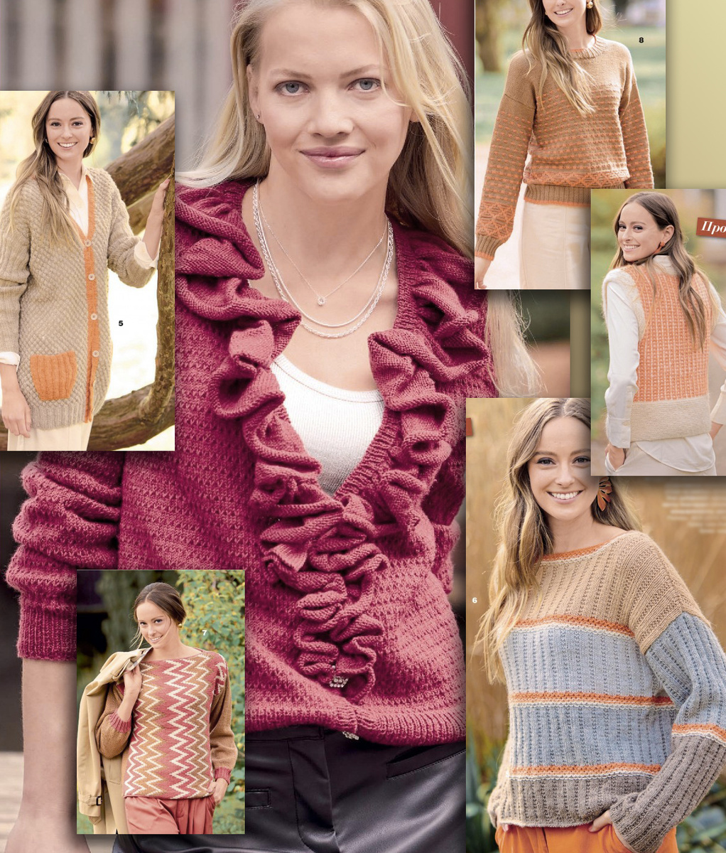 Не стала показывать модели по отдельности, несколько, особо меня впечатливших, собрала в коллаж. Ну посмотрите: бежевый кардиган с оранжевыми планкой и карманами, коричневый пуловер с оранжевым жаккардом, полосатый пуловер 🤦♀️.