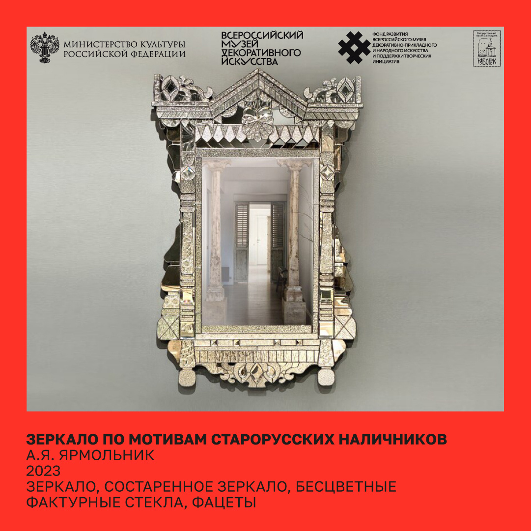 «Свет мой, зеркальце! скажи, Да всю правду доложи: Я ль на свете всех милее, Всех румяней и белее?» — вопрошала злая царица в «Сказке о мёртвой царевне и о семи богатырях». А в романе «Евгений Онегин» автор наделяет зеркало мистическими свойствами, описывая, как Татьяна в святочный вечер гадает: «…Татьяна на широкий двор В открытом платьице выходит, На месяц зеркало наводит…». В произведениях А. С. Пушкина образ зеркала многогранен — это символ правды, самопознания и, конечно же, волшебства! А каким представляют зеркала современные дизайнеры? Какими смыслами и способностями наделяют один из самых «магических» предметов интерьера? Зеркало по мотивам старорусских наличников А. Ярмольник — это арт-объект и одновременно полноценный элемент интерьера. Придумывая форму, дизайнер вдохновилась оконными резными наличниками — уникальным культурным наследием России. В зеркальной мозаике угадываются архитектурные элементы — треугольный фронтон, колонны, розетки. Вдохновение формами городской архит