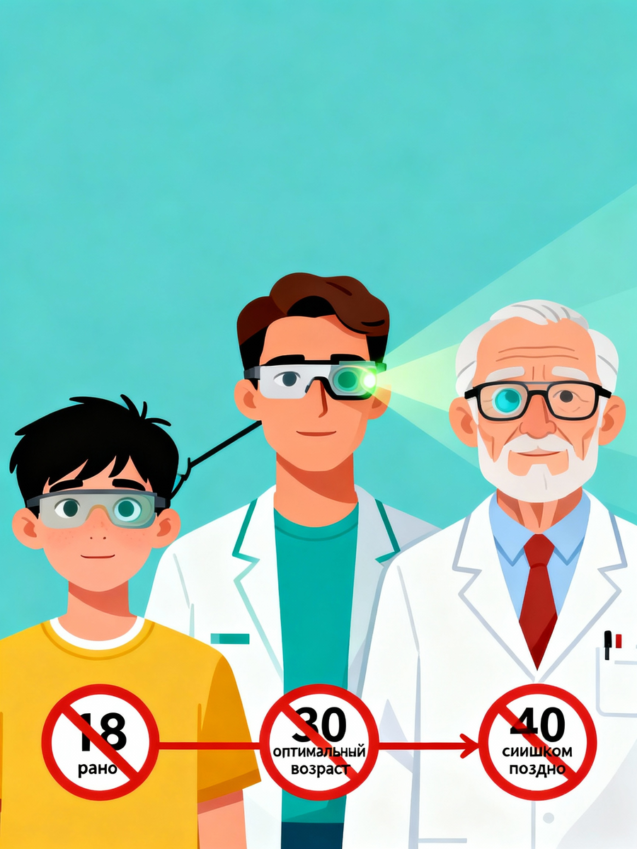 Понимание всего описанного выше и дает нам ответ на вопрос о рекомендуемых сроках проведения лазерной коррекции зрения. До стабилизации роста глаза в юности очевидно рано: любой идеальный в моменте результат обречен на провал. А чем ближе мы подходим к возрастной отсечке в 40 лет, тем важнее промерять запас аккомодации (то есть способность внутриглазной мышцы сокращать хрусталик и менять его преломляющую силу) и подробнее обсуждать зрительные задачи с пациентами, привыкшими идеально видеть на очень близких расстояниях.