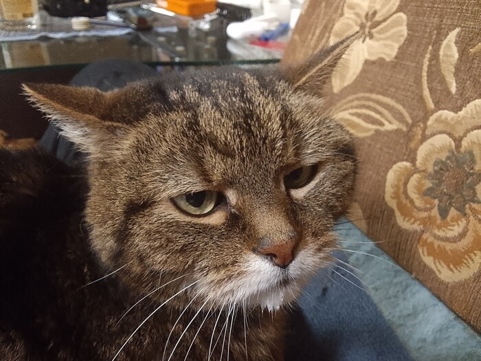 Привет ещё раз. Я тут обещал давеча про всякое котовье поголовье рассказывать. Это Тунгус. Мы его зовём Тунгусь, так он выглядит. Не знаю, отчего у него такое лицо грустное, как у одного мемного кота. То ли природа так распорядилась, то ли жил он не в благополучном доме. Я б тоже взгрустнул сильно вплоть до клинической депрессии. Жил он с другой кошкой, про неё потом расскажу. Детали придержу при себе, этого не стоит знать. Упомяну только, что его часто били ногами и кормили когда держатель проспится. Его и Мусю мы с женой забрали месяц назад после смерти держателя и у нас после этого как раз и настало котовье поголовье. Хотя и до этого оно было, но восемь это не шесть. Наши сначала принюхивались, типа это чо за баклажаны, с какова раёна, но дня через три начали коммуницировать. Первую неделю Тунгус жил под ванной. Ненуачо, там тепло, поскольку сельхозработы регулярные, плюс никто особо туда не лезет и он, может быть, мизантроп. Ещё он практически не мяукал. Максимум, что можно было от