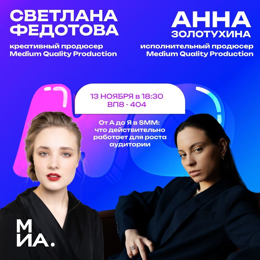 Помнишь, какой завтра день? 🙂 Приходи пообщаться о главном вопросе в медиа вместе со Светланой Федотовой, креативным продюсером Medium Quality Production, и Анной Золотухиной, продюсером рекламных интеграций Medium Quality Production 🗓 13 ноября в 18:30 📍 РГСУ, ул. Вильгельма Пика, д.4, стр.8, ауд. 404 📎 Подписаться на МИА