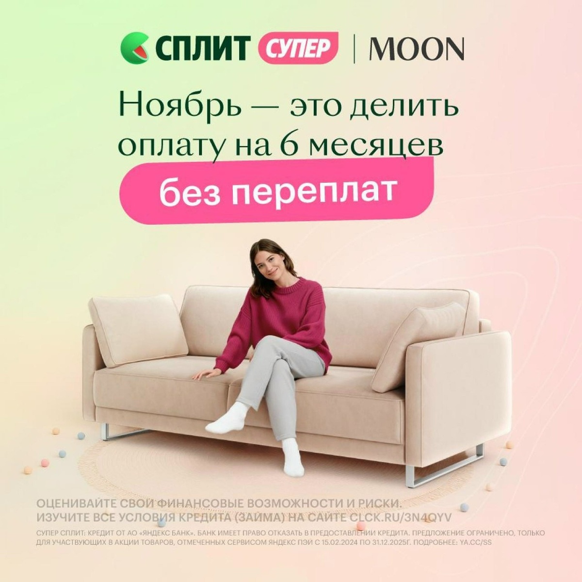 Вы заслуживаете отдыха здесь и сейчас Поэтому мы сделали покупку дивана или кровати еще проще. С 1 по 30 ноября выбирайте при оформлении заказа Яндекс Сплит, и мы разобьем ваш платеж на удобные части. Платите без переплат до 6 месяцев, внося сумму раз в месяц по вашему графику. Выбрать свою мебель можно по ссылке: https://clck.ru/3QHFN4 Реклама. ООО «Живые диваны», ИНН 5029042443