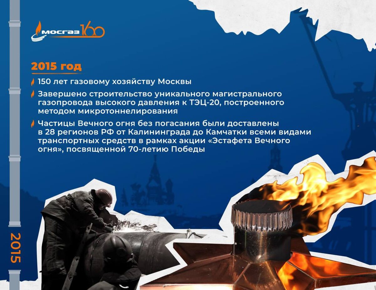 🔥Возвращаемся в 2015 год 🎉 Газовое хозяйство Москвы отметило юбилей 150 лет. 🔜 Завершено строительство уникального магистрального газопровода высокого давления к ТЭЦ-20 методом микротоннелирования — еще один инновационный шаг в обеспечении энергетической безопасности города. 🔜 В рамках акции «Эстафета Вечного огня», посвященной 70-летию Победы, частицы Вечного огня были доставлены в 28 регионов России — от Калининграда до Камчатки! #ГазовомуХозяйствуМосквы160 @aomosgaz