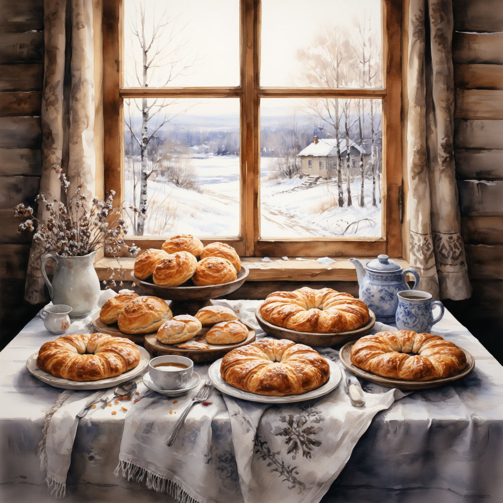 Приготовление пищи в этот день имело глубокий символический смысл. Хозяйки пекли караваи из ржаной или пшеничной муки — символ плодородия и достатка; пироги с разнообразными начинками (капуста, грибы, яйца, рыба) — знак гостеприимства и щедрости; маленькие булочки и крендели — для угощения детей и соседей. Аромат свежей выпечки наполнял избы, создавая ощущение уюта и защищённости. Часть хлеба обязательно оставляли «для домового», кладя кусочек за печку или в дальний угол кладовой.