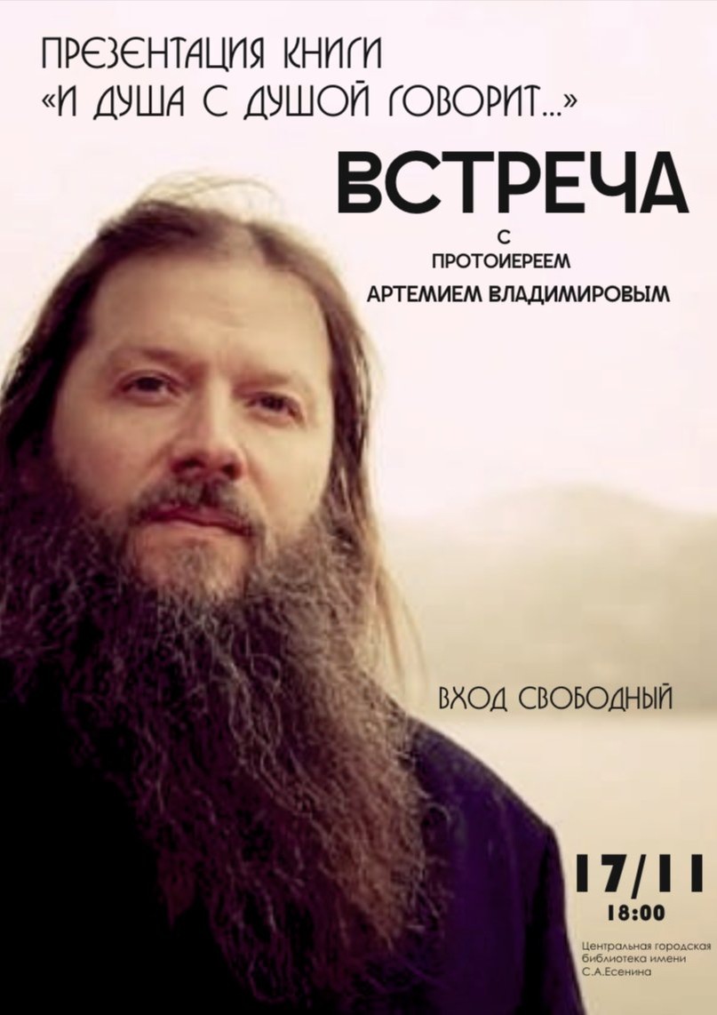 Приглашаем всех желающих на творческую встречу и презентацию книги протоиерея Артемия Владимирова. Просим распространить информацию, пригласить прихожан и разместить афиши на досках объявлений. Встреча состоится 17 ноября в 18.00 в городской библиотеке им. Есенина на ул. Вокзальной