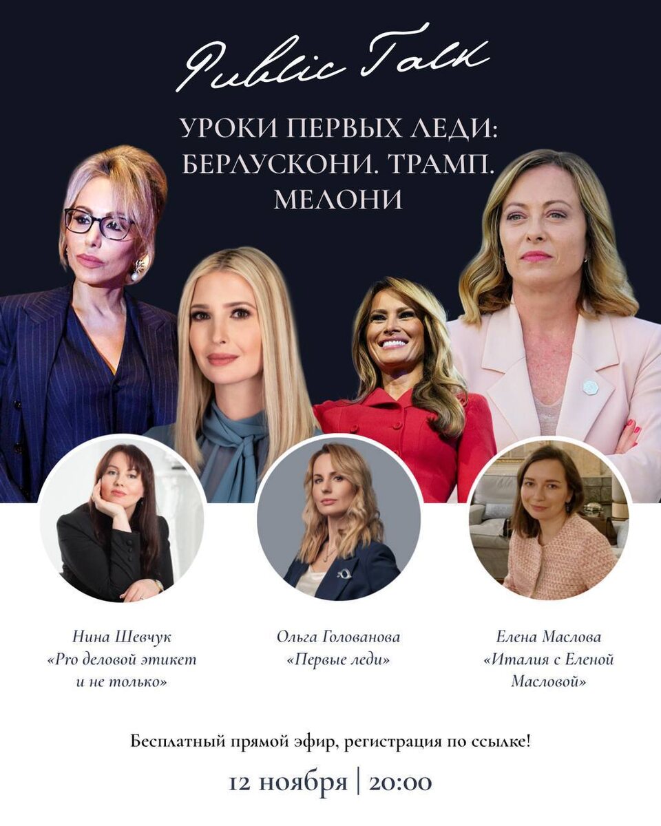 Друзья, спешу напомнить, что сегодня в 20.00 мы встречаемся в Zoom на паблик-ток «Уроки первых леди», который проведем совместно с авторами каналов «Первые леди» и «Италия с Еленой Масловой, Италомания». В фокусе нашего внимания в этом выпуске будут Мелания и Иванка Трамп, Марина Берлускони и Джоржа Мелони — их образы, стили поведения, особенности коммуникации. Моими партнерами в эфире будут: ⁃ журналист-международник с многолетним бэкграундом в МИДовском пуле, интервьюер Эрдогана, Аббаса, Эштон и многих других первых лиц, доцент Финансово университета Ольга Голованова, ⁃ эксперт по политике и истории Италии, старший научный сотрудник ИЕ РАН, доцент МГИМО и НИУ ВШЭ, автор и соавтор более 100 академических публикаций, к. полит. наук Елена Маслова. 🔴 Участие по регистрации, бесплатно. Если еще не регистрировались, то скорей регистрируйтесь)) В письме, подтверждающем регистрацию, вам сразу придет ссылка на эфир. 🔴 Всем, кто регистрировался раньше, мы утром отправили ссылку, а сейча