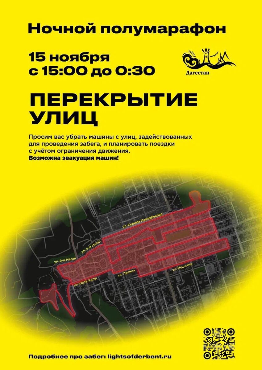 20 улиц города будут перекрыты 15 ноября с 15:00 до 00:30. В Дербенте, 15 ноября пройдет уникальный полумарафон «Огни Дербента». В связи с этим мероприятием с 15:00 до 00:30 будет временно ограничено движение транспорта по следующим улицам: 🔹5-й Нагорный переулок, 🔹6-й Нагорный переулок, 🔹ул. Орта-Капы, 🔹ул. Н. Крупской, 🔹ул. С. Стальского, 🔹пер. Гаджиева, 🔹ул. Самурского, 🔹ул. Пушкина, 🔹ул. Ленина, 🔹ул. Таги-Заде, 🔹ул. Дахадаева, 🔹ул. М. Рзаева, 🔹ул. К. Мамедбекова, 🔹ул. 1-9 Магалы, 🔹ул. Э. Пашабекова, 🔹ул. Курбанова, 🔹ул. Дрожжина, 🔹ул. Эмиргамзаева, 🔹ул. Айдынбекова, 🔹ул. Канделаки. 🚩Транспортные средства, мешающие движению атлетов, будут эвакуированы перед началом забега. 👍Мой Дербент | Подписаться