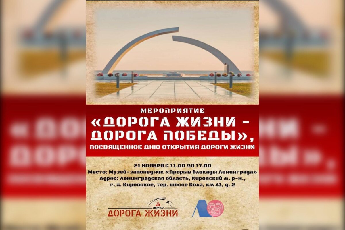 У музея‑заповедника «Прорыв блокады Ленинграда» 21 ноября состоится большое памятное мероприятие «Дорога Жизни – Дорога Победы», приуроченное к Дню открытия Дороги жизни. Организатором выступает музейно-мемориальный комплекс «Дорога жизни». Программа объединит памятные, культурные, образовательные и интерактивные форматы: выступления артистов Театра драмы им. Ольги Берггольц и акция «Открытый микрофон: Письма с фронта». Также будет представлена концертная программа на уличной площадке и военно‑историческая реконструкция. Будут работать интерактивные зоны: тематические выставки, фотозоны, квест для гостей, мастер‑классы, VR‑экскурсии по Дороге жизни и музеобус «Дорога Жизни – Дорога Труда» от АНО «Главленретротранс». Финальным событием станет итоговая конференция, посвященная Году 80‑летия Победы. Она подведет смысловые итоги дня и подчеркнет связь поколений через память о подвиге защитников Ленинграда. Полная программа мероприятия доступна по ссылке. Ранее сообщалось, что в Петербурге
