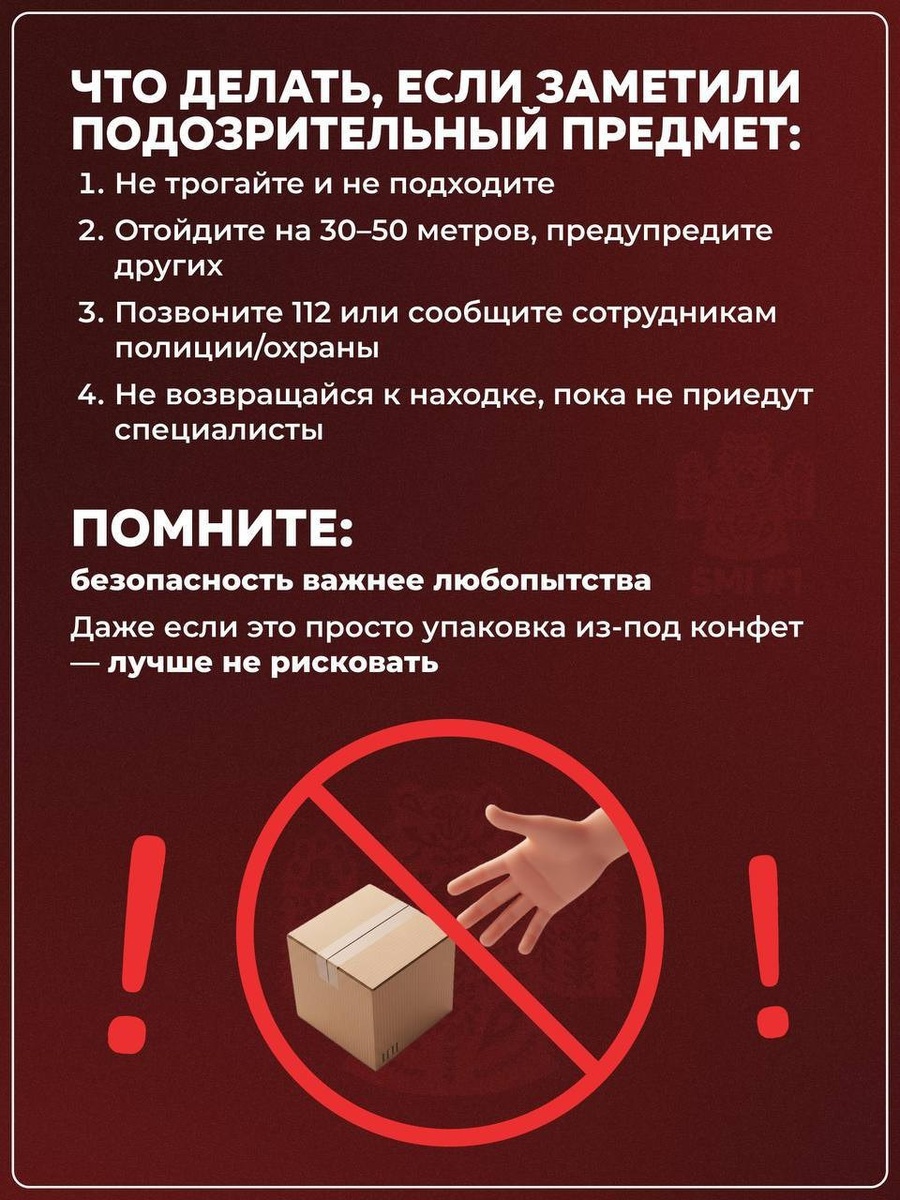Что делать, если вы обнаружили подозрительный предмет на улице. После ужасного происшествия с мальчиком из Красногорска, в руках которого взровалась «купюра», я решила подготовить для вас памятку, как вести себя, если вы увидели на земле подозрительный (а может и не очень) предмет. Напоминаю, девятилетний ребёнок в Красногорске нашёл рядом с детской площадкой свёрток, замаскированный под десятирублёвую купюру. Когда он поднял находку, внутри сработало самодельное взрывное устройство. Ребенок получил тяжёлые травмы правой руки — врачам пришлось частично ампутировать пальцы. Отправляйте близким ⤵️ И будьте осторожны, берегите себя!