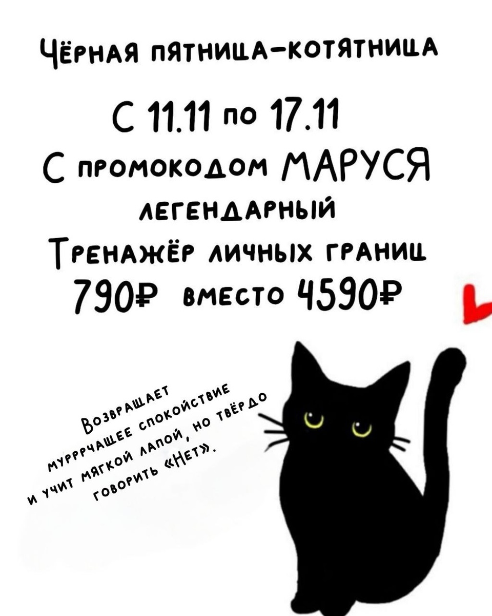 Посмотрите, как мастерски кошки отстаивают свои границы: сначала используют мягкие намёки и вежливые просьбы лапочкой «Не стоит этого делать», а если их не слышат — без колебаний обозначают границу предупредительным кусем или просто уходят в другую комнату. Этому спокойному и уверенному искусству говорить «нет» можно научиться. С помощью нашего легендарного Тренажёра личных границ — безопасного пространства, где вы можете отточить этот навык без стресса и риска для отношений. 🎁 Только с 11.11 по 17.11 в честь Черной пятницы-котятницы забирайте вечный доступ к тренажёру по промокоду МАРУСЯ всего за 790 ₽ вместо 4590 ₽. В удобном боте в Телеграмм: ✅ Вам будет предложена реалистичная ситуация: начальник просит поработать в выходной, или родственник даёт непрошеный совет. ✅ Вы отвечаете так, как хочется в моменте, на самом деле — честно и без купюр. Этот шаг важен, чтобы выплеснуть эмоции и увидеть свою привычную модель поведения. ✅ В ответ вы получаете то, чего так не хватает в реаль
