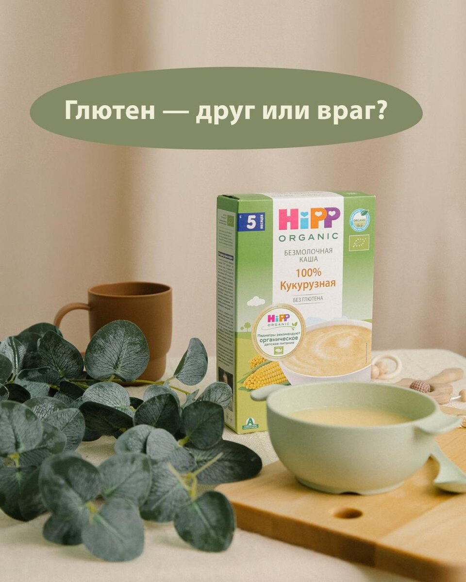 Одни люди утверждают, что глютен — это вредно, другие, что отказ от него — просто модное веяние. А мамы хотят лучшего для своего крохи и изучают километры контента. Давайте разберёмся в теме без мифов и эмоций Это белок, который содержится в злаках: пшенице, ржи, ячмене. Именно он делает тесто эластичным и помогает хлебу держать форму. Сам по себе глютен — не враг, и для большинства детей он абсолютно безопасен. Если у малыша нет подтвержденной непереносимости глютена или особых показаний врача в отношении глютена, то не стоит совсем исключать этот белковый комплекс из рациона. Продукты с глютеном могут быть источником полезных веществ: клетчатки, витаминов группы B, витамина Е, микроэлементов, в том числе железа, меди, цинка, магния. Как правильно и вовремя познакомить малыша с этой группой белков? 🥄 Начать лучше с безглютеновых каш*. В ассортименте HiPP представлены 100% органические каши для первого прикорма: гречневая, рисовая, кукурузная. 🥄 После можно предлагать каши с глютено