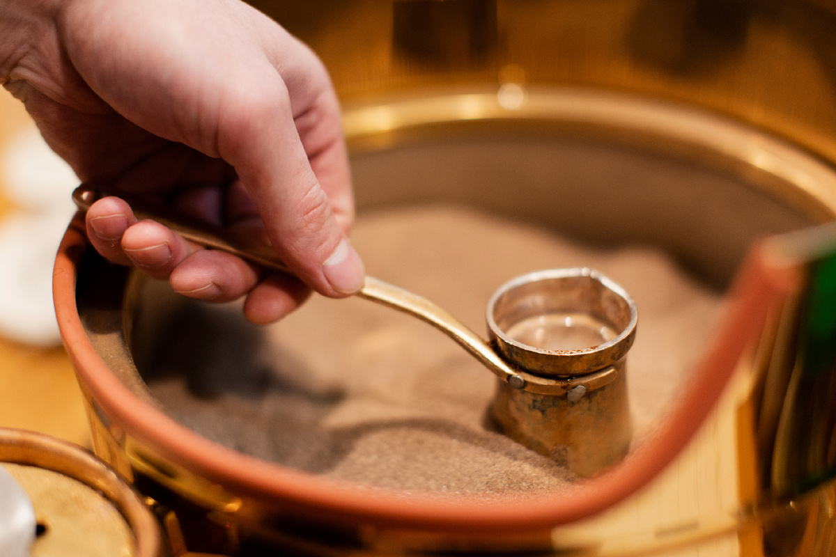У нас в городе открылась новая кофейня, и ее главная особенность — кофе, который готовят по старинной технологии, на раскаленном песке. Вообще я шла в соседнюю кофейню за капучино, мое любопытство изменило изначальный планы, и я отправилась на разведку. В меню представлено 3 варианта: классический, с молоком и с молоком и солёной карамелью. Мой выбор пал на вариант — кофе с молоком. И то, что я увидела и попробовала, заставило взглянуть на привычный напиток совершенно под другим углом. Итак, что это за метод такой? Основа всего — глубокий металлический поддон с мелким, практически пудровым песком, который разогревается снизу. В этот песок бариста погружает медную джезву с молотым кофе и холодной водой. И вот здесь начинается самое интересное. В отличие от быстрого огня газовой конфорки, песок нагревает турку со всех сторон, очень плавно и равномерно. Это неспешный, почти медитативный процесс. Кофе не пытается мгновенно убежать, а медленно поднимается, насыщаясь кислородом и образуя гус