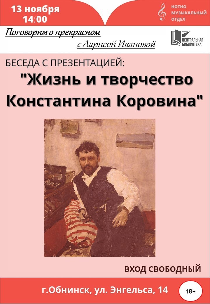 🗣13 ноября в 14:00 в Центральной библиотеке в нотно-музыкальном отделе состоится беседа с презентацией с Ларисой Ивановой «Жизнь и творчество Константина Коровина». Вход свободный. Обнинск, ул. Энгельса, 14. 👍 Подписаться | Ваша реклама
