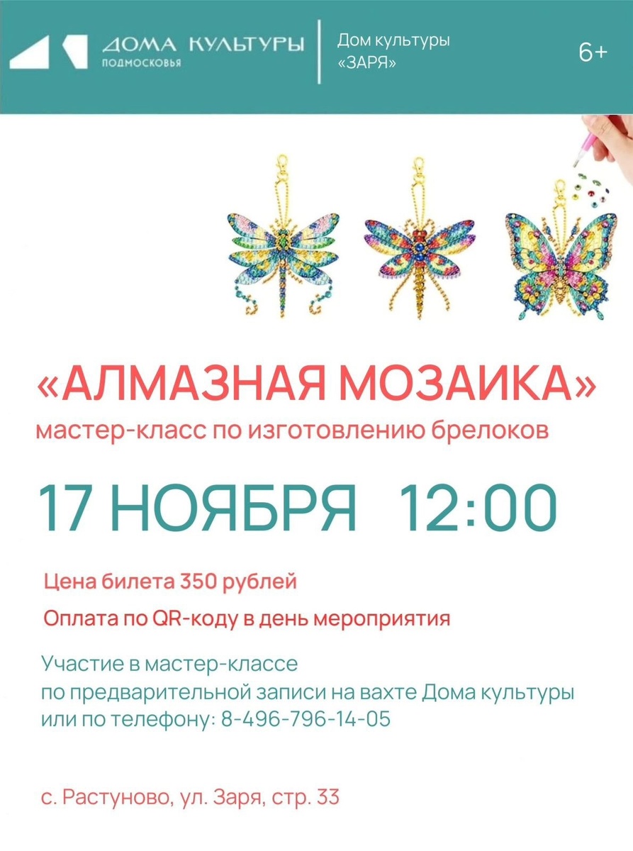 ✨ Сельский Дом культуры «Заря» приглашает мальчишек и девчонок в дни школьных каникул на мастер-класс по изготовлению брелоков «АЛМАЗНАЯ МОЗАИКА» Оплата по QR-коду в день мероприятия. ❗️Запись на участие в мастер-классе на вахте Дома культуры или по телефону: 8(496)796-14-05 Ждём вас в нашем гостеприимном Доме культуры «Заря»! 💫 🚫 Возраст: 6+ 📆 17.11.2025🕒12:00 🏢 Сельский дом культуры (СДК) «Заря» 📍 г.о.Домодедово, с.Растуново, ул.Заря, д.33 💰 Цена: 350 ₽ ✅ Мероприятия Домодедово https://dzen.ru/id/66f10385cc4c5a16f7b5fb02 http://vk.com/domodedovo_events http://dzen.ru/domodedovo_events