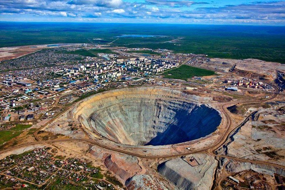 Алмазное месторождение было открыто группой геологов в 1955 году, спустя два года начали разработку. В 1960-х годах на трубке «Мир» ежегодно добывали по 2 тонны алмазов, из которых 20% приходилась на алмазы ювелирного качества, остальные были пригодны для применения в разных отраслях. Глубина карьера «Мир» 525 метров – этого достаточно, чтобы Эйфелеву башню разместить в нём с запасом. Карьер «Мир» в Якутии – это один из крупнейших алмазных карьеров в истории, который на десятилетия задал тон всей алмазной отрасли. На пике своей работы (закрыт в 2001 году) карьер выдавал до 2 млн карат алмазов в год (до 20% всей добычи страны), а за годы эксплуатации извлёк алмазов на $18 млрд. Его уникальность в сочетании невероятных масштабов и сложнейших условий – работы велись в условиях многолетнемерзлых грунтов, требующая специальных технологий оттайки. Работа на карьере прекращена в 2001, но с 2009 начата добыча в подземном руднике «Мир». В 2017 произошла авария (прорыв грунтовых вод) и рудник