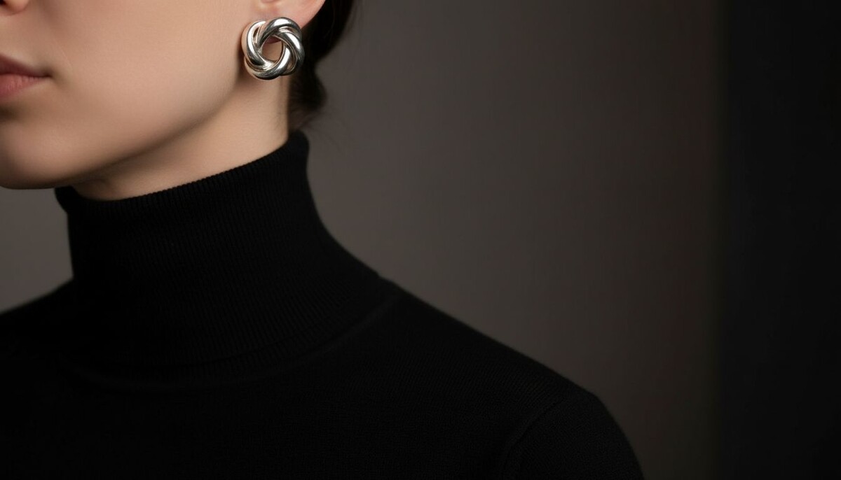 Водолазка - это униформа зимы 2025. Она создает идеальный фон для акцентных серег. Секрет в том, чтобы выбрать водолазку с плотным, но не слишком высоким или рыхлым воротником, который не будет «съедать» пуссеты. Если воротник очень высокий, как мы видим в тренде «Архитектура Шеи», серьги должны быть максимально гладкими и крупными, чтобы не цепляться за трикотаж. Архитектура Шеи: Как Водолазка с Гипертрофированным Воротником требует, чтобы ювелирное изделие находилось ниже линии подбородка, но при этом было видно сбоку.
