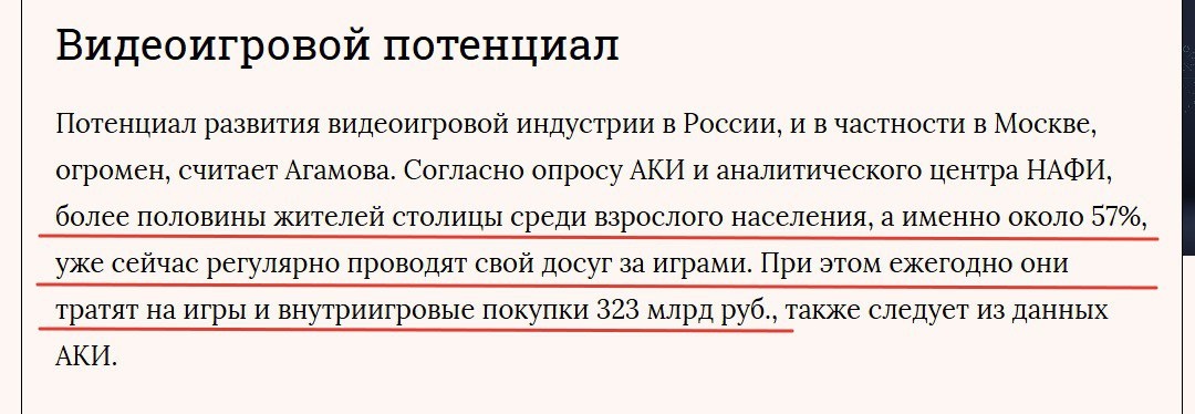 Хех... - это отсюда ("Ведомости"; и TADViser перепостили). И это при том, что объем видеоигровой индустрии в России по итогам 2025 - 200 млрд руб. Не, ну если "Москва - не Россия" (с) - то тогда ок = ) Если серьезно, то думаю, что госпожа Гюльнара Агамова оговорилась и надо просто сместить запятую до показателя 32,3 млрд рублей/год - тогда все укладывается в аналитическую логику.