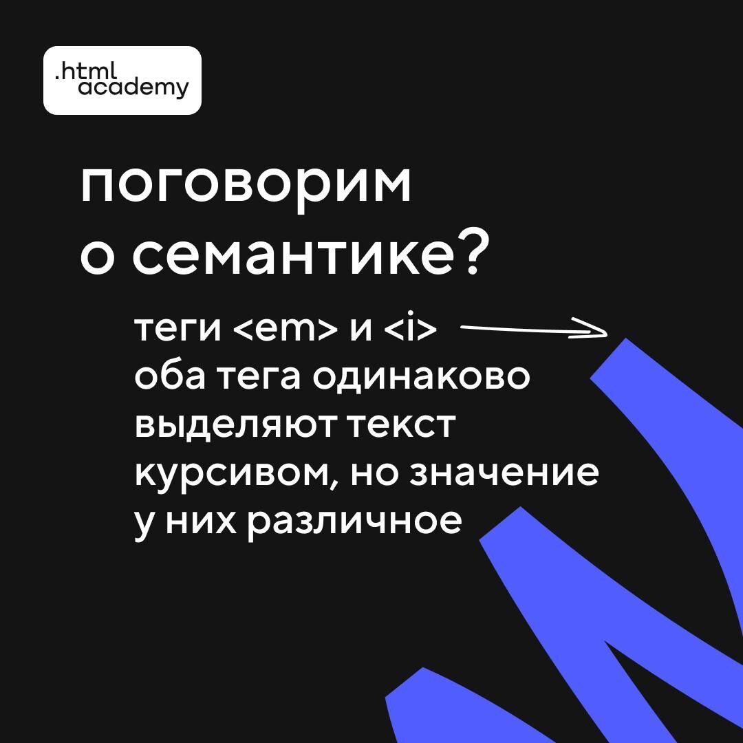 Поговорим о семантике? Листайте карточки, знакомьтесь с тегами <em> и <i>, а потом закрепляйте полученные знания в опросе ниже. Попрактиковаться и посмотреть на примеры можно в интерактивной главе «Разметка текста».