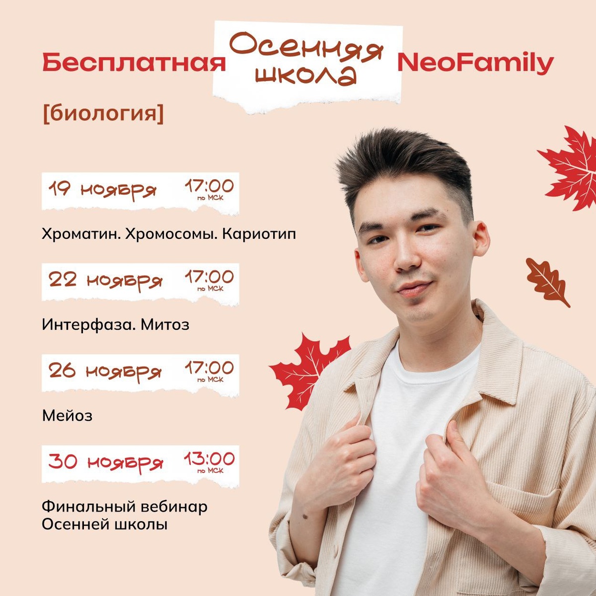 3 открытых веба по клеточной теории на Осенней школе🔥 Ребята, вчера мы открыли набор на бесплатную школу! Регистрируйтесь в боте и получайте куратора, если вы ещё не — будет мега продуктивно Вебинары проходят в 17:00 по Москве, и записи мы обязательно сохраним для всех, кто не может онлайн 🤞 19 ноября — разбираем хроматин, хромосомы, кариотип и прочие штуки, связанные с ДНК. Научимся отличать гомологичные хромосомы и сестринские хроматиды, считать количество аутосом и половых хромосом в разных клетках 22 ноября — начнём жизненный цикл клетки: интерфазу и митоз. Очень важная тема, откроет вам доступ к пониманию мейоза. Мы научимся находить плоидность и количество хромосом на каждом этапе жизненного цикла клетки 26 ноября — проходим мейоз! Разберёмся, в чём отличие от митоза, различия двух этапов мейоза, зачем природа придумала кроссинговер и ещё куча интересного. Это важная тема для понимания генетики! Вы узнаете, почему вероятность вашего рождения почти равна нулю) На вебах мы