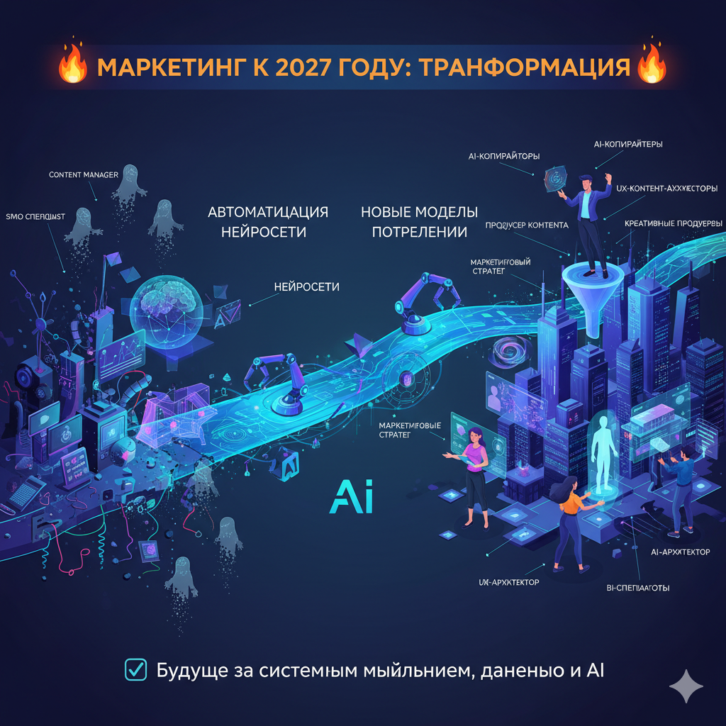 По прогнозам экспертов, к 2027 году маркетинг изменится до неузнаваемости. Автоматизация, нейросети и новые модели потребления вытеснят целые профессии. Если ты работаешь в маркетинге — пора адаптироваться, иначе рискуешь остаться за бортом. Раньше они писали посты, описания товаров, статьи по ТЗ. Теперь это делает GPT и другие нейросети — быстрее, дешевле и с A/B тестами. Что заменит: