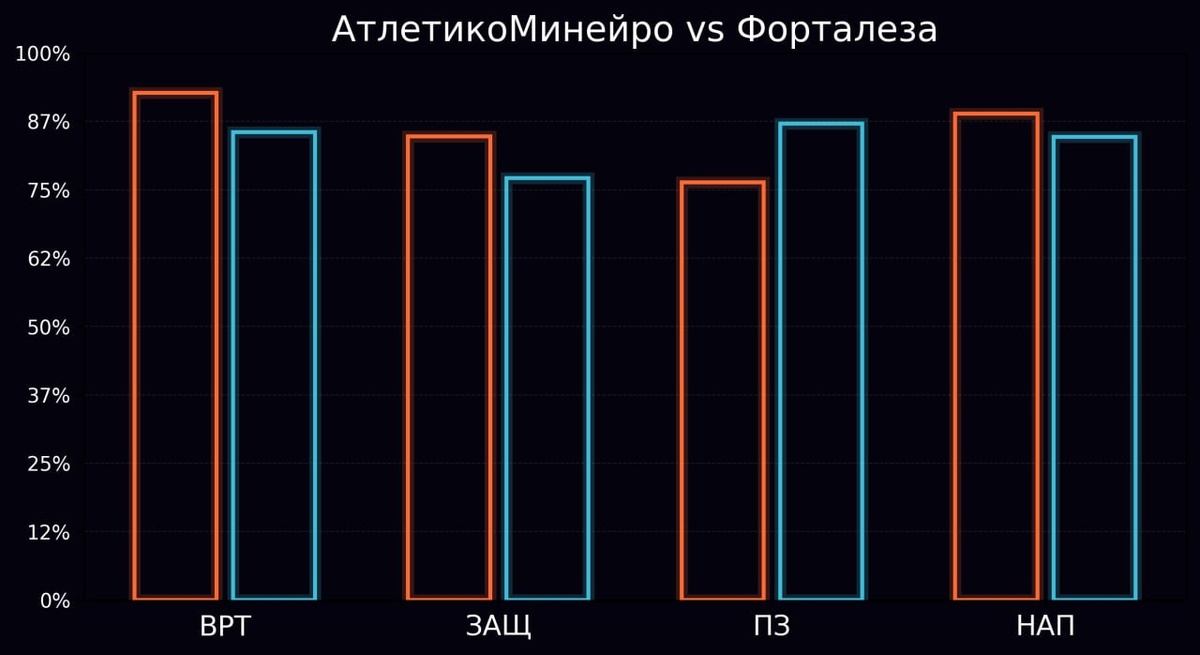 Бразилия — Серия A Решил разбавить немного ожидание обзора лиги 1. Прогнал модель Archiect по предстоящему матчу в Бразилии. Атлетико Минейро – Форталеза xF: 67% vs 66% (Δ = +1 п.п.) Tier C Картина матча Минимальный разрыв по форме и функциям, близкий к паритету - намекает нам на то, что хозяева сегодня не такие уж и фавориты. Атлетико чуть устойчивее в атаке (69% против 64%), тогда как Форталеза выглядит плотнее в центре и чуть лучше по защитной функции (65% против 64%). Тактический баланс Минейро опирается на прямолинейную игру с акцентом на напор в финальной трети (превес по линии атаки 71% vs 67%), но центр уступает гостям (61% vs 69%). Это создаёт риск фрагментированности между линиями. Форталеза же держит структуру плотнее, но ей сложнее пробить насыщенный тыл соперника (в перекрёстке 71 vs 61 в пользу Минейро). Функциональные акценты Преимущество Минейро в атакующей функции (69%) компенсируется лучшей защитной организацией Форталезы (65%). Потенциал давления хозяев выше, н