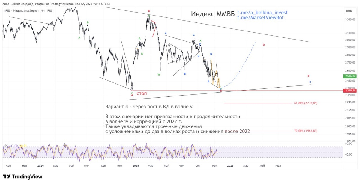 #IRUS #MICEX Российский рынок продолжает снижение. От локальных низов 27-28 октября не было завершения нисходящей структуры конечной диагонали волны С of Y of C (индекс ММВБ, аналогичная структура на фьючерсе); с локальных низов развивалась троечная структура. Всё вместе указывало на локальны откат, но не смену тенденции. При этом важно завершить нисходящую структуры субволны с of x треугольника, сохранив уровень стопа по завершению первой волны треугольника а of x (2370 пунктов). Также ранее отмечала, что подавляющее большинство бумаг на российском рынке НЕ готовы к развороту, продолжая движения в коррекционные структурах. Это по-прежнему актуально. Подробнее в видео. Не является ИИР 💪 БОЛЬШЕ разметок в Закрытом канале: Бот Закрытого Канала (подписаться из-за границы, пишите личным сообщением)