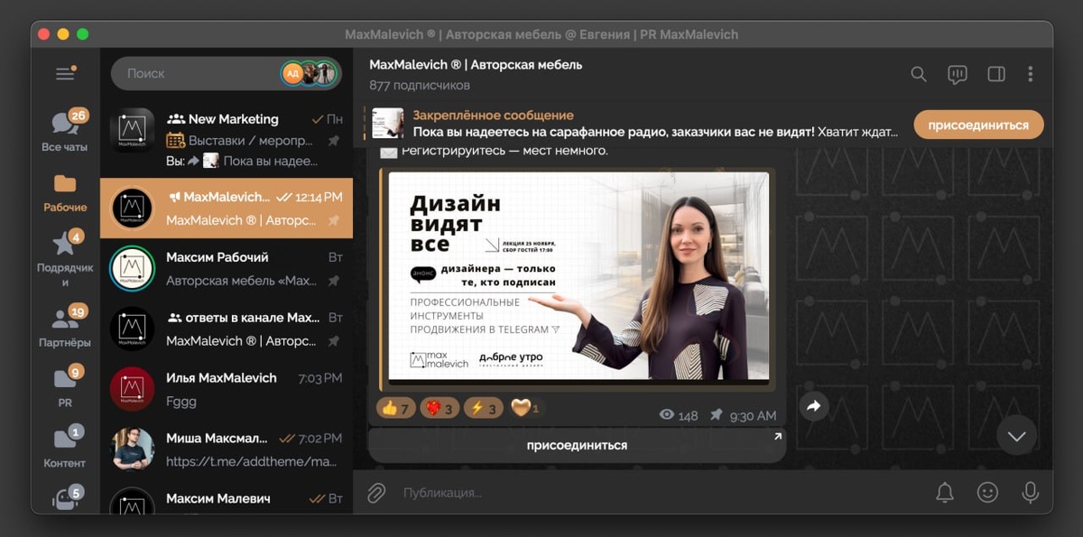 В ответ на пост ✨ Стиль начинается с деталей — даже в Telegram. Создать свою узнаваемость, быть ближе к аудитории, формировать желание следить за вами — это не только про контент. Это про атмосферу. Про то, как вы оформлены, как звучите, как выглядите даже в мессенджере. Совсем скоро, на лекции «Запуск и развитие блога интерьерного дизайнера в Telegram», мы подробно расскажем, как превратить канал в инструмент роста и монетизации вашего бренда. А пока — начните с малого, но символичного шага. Мы создали уникальную тему для Telegram в стиле MaxMalevich — лаконичную, светлую, вдохновляющую, с характером настоящего создателя. 💬 Ощутите эстетику MaxMalevich прямо в своём мессенджере: 👉 t.me/addtheme/maxmalevich — максимально эстетично в версии telegram desktop Пусть даже ваша переписка работает на ваш личный бренд.