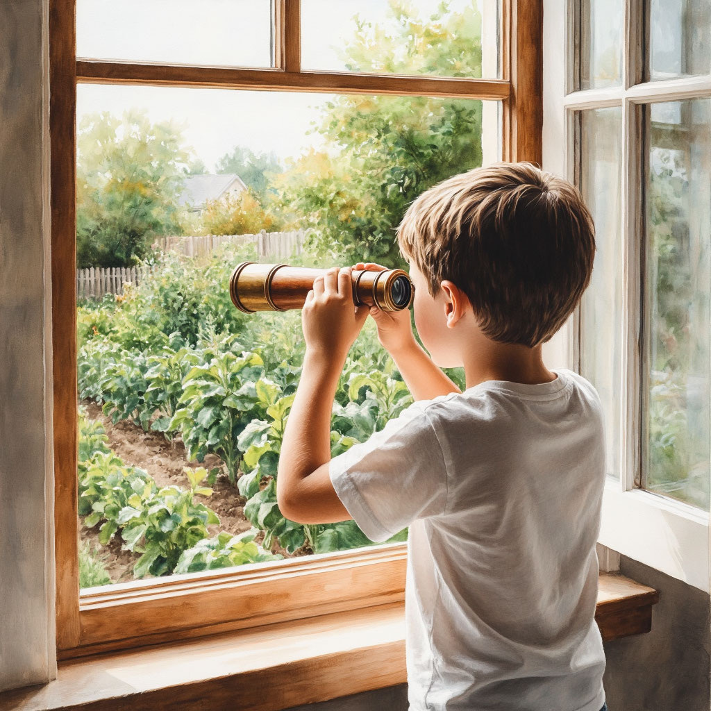 Важное дело нашлось сразу же. После обеда бабушка озабоченно сказала, что кто-то таскает у неё с огорода клубнику. Нужен был сыщик. Вася, вооружившись подзорной трубой, устроил засаду за старой яблоней. Мир, увеличенный в несколько раз, казался совсем другим. Муравей превращался в богатыря, а бабочка – в сказочную фею.