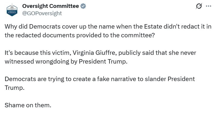 В ответ на пост Republicans PUSH BACK on Epstein email release, accusing Democrats of political SLANDER They question redacting the victim's name, who 'has publicly said she never witnessed wrongdoing by President Trump' The Epstein file saga continues