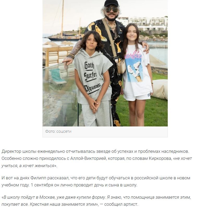 И Филипп, вместо того чтобы взять себя в руки и стать настоящим отцом-авторитетом, который умеет запрещать, выбирает самый лёгкий и циничный путь. Проще ведь отправить детей в дорогой пансионат с европейскими педагогами и купить себе спокойствие за миллионы! Иначе как объяснить это пятикратное "выдергивание" сына и дочери из российской школы на Рублёвке и отправку их обратно в Дубай за последние пару лет? Это не "любовь к Родине", это "бегство от ответственности". Каприз избалованного ребёнка (Алла-Виктории), которому захотелось "зажигать в престижном квартале жаркого города", и слабость отца, который не умеет сказать "нет".
