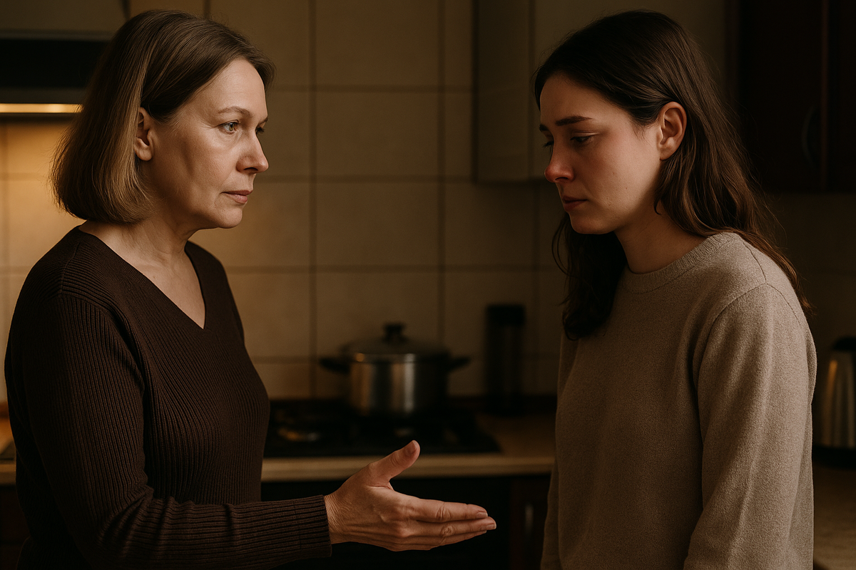 Эта фраза разделила воздух на до и после. Лампа не мигнула, кастрюля не взорвалась, пол не проломился. Всё осталось на местах. Только внутри Нади кто-то резко выключил звук: слышно стало только своё сердце и как где-то далеко щёлкает холодильник.