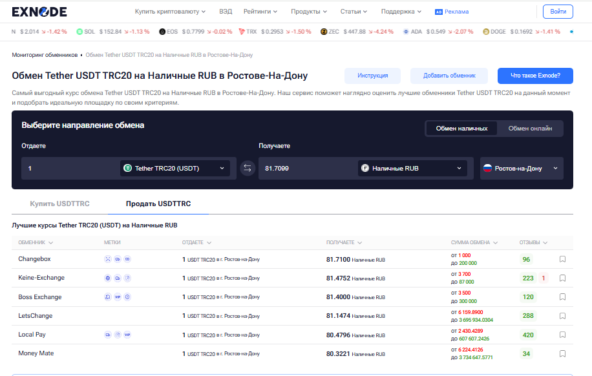 Чтобы выбрать надежный обменник и не столкнуться с сомнительными предложениями, удобно пользоваться проверенными сервисами мониторинга, такими как Exnode. С его помощью можно оценить рейтинг обменников, ознакомиться с отзывами пользователей и получить актуальные данные о легальных обменниках криптовалюты в Ростове-на-Дону, их адресах и телефонах. Такой подход обеспечивает уверенность на каждом этапе сделки и делает обмен криптовалюты прозрачным и безопасным.