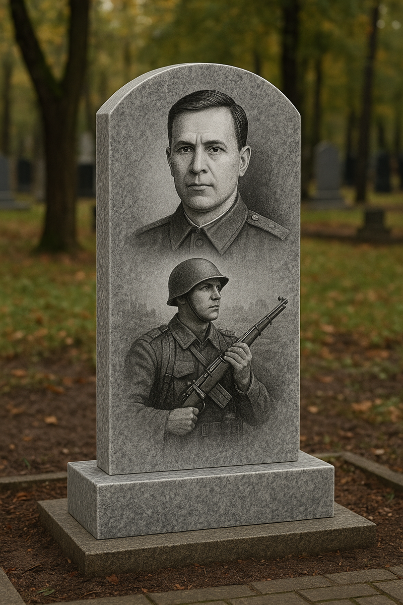 Во-первых, авторская резьба. Мы создаём барельефы, портретные медальоны, символические изображения (оружие, военная форма, профессиональные атрибуты), которые выполняются вручную с максимальной точностью. Портрет на камне — это не механическая гравировка, а работа художника, способного передать взгляд, черты лица, выражение, знакомое близким.