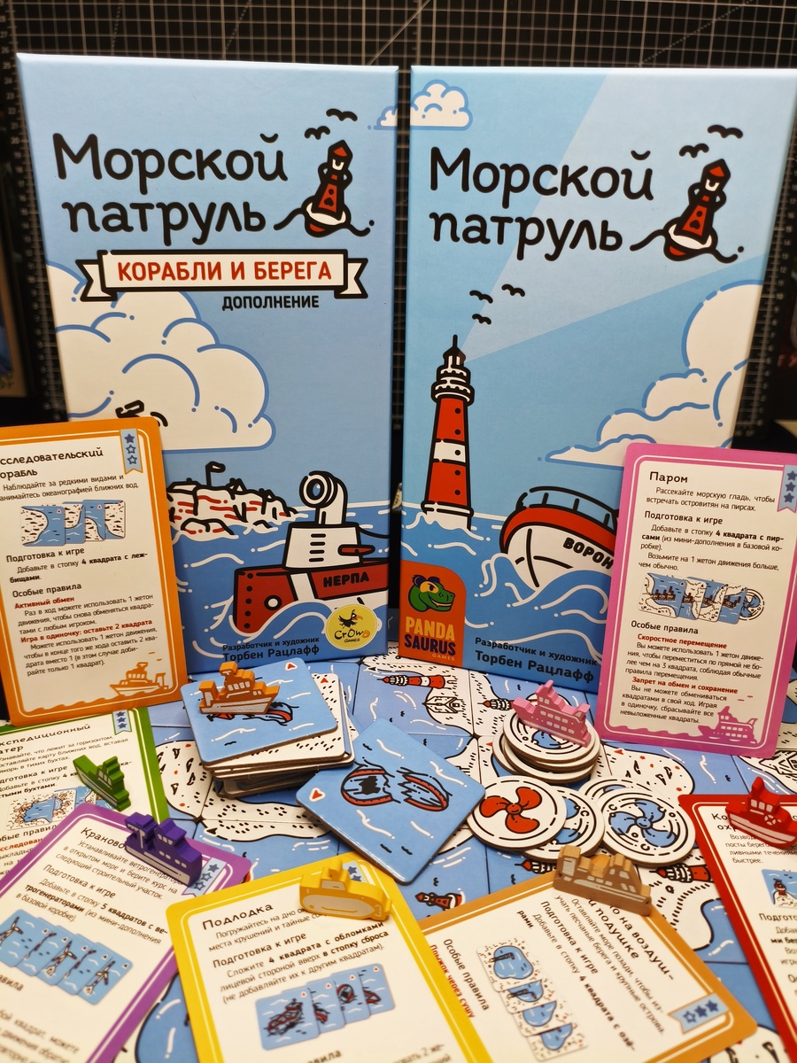 18.10.2025 Не так давно, буквально в этом году, я уже успел поиграть в «Морской патруль» и даже написал впечатления от игры. Вот тут – (vk.com/wall-159124369_2781). А тут уже и дополнение подоспело, которое оказалось очень годным, но обо всё по порядку. В дополнении «Корабли и берега» появляются новые типы кораблей. Ну, как новые, в базовой игре они просто имели разные цвета. Тогда как здесь, каждый из 7 новых кораблей имеет свой тип, способность и особые правила подсчёта с использованием новых тайлов. Звучит как что-то прикольное? Так и есть. Если вкратце пробежаться по правилам дополнения, то в общей сумме их здесь кот наплакал. Процесс подготовки практически не изменился – всё легко и быстро, изменения появились лишь в части с добавлением тайлов. Раньше можно было добавлять пирсы или ветряки, а теперь в общий набор добавляются тайлы выбранных на партию кораблей. Ну а основные изменения кроются именно в геймплее за каждый из них. Если чуть подробнее, то у нас появляются Паром, Кранов