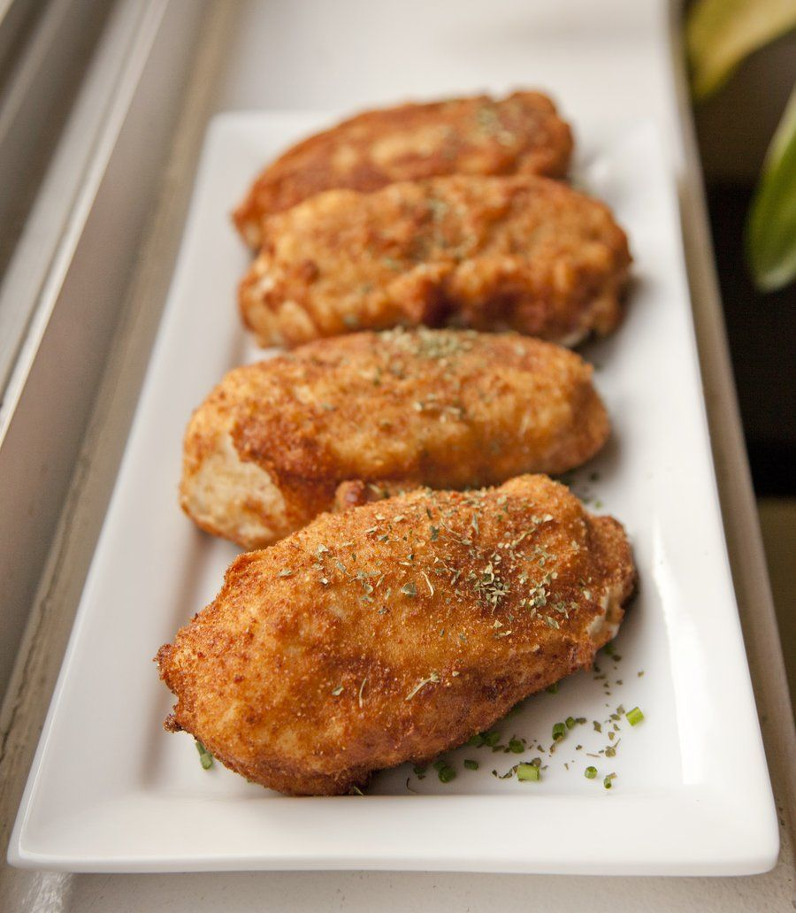 Они не похожи на котлеты по-киевски или пожарские, так как тут принцип приготовления и мясо совсем другие. Такое блюдо можно смело подавать к праздничному столу. 3 куска свиной вырезки, каждый примерно по 130 граммов 90 граммов сливочного масла 150 граммов твердого сыра соль перец яйцо + мука + панировочные сухари для обсыпки растительное масло для жарки Отбейте кусочки свинины молотком для мяса, как на шницели, очень тонко. Приправьте солью и перцем. Натрите сыр на мелкой терке и смешайте с мягким сливочным маслом. Можно добавить сюда свежую зелень, чеснок или орехи. Из приготовленной масляно-сырной смеси сформируйте руками три продолговатые колбаски. Положите каждую колбаску в центр отбивных. Сложите мясо на начинку, подворачивая края, как заворачиваете блинчик с начинкой в конвертик. Аккуратно прижмите края, чтобы начинка не вытекла во время жарки. Сформированные котлеты обваляйте последовательно в муке, окуните во взбитое яйцо и панировочные сухари. Разогрейте духовку до 190-200 гр