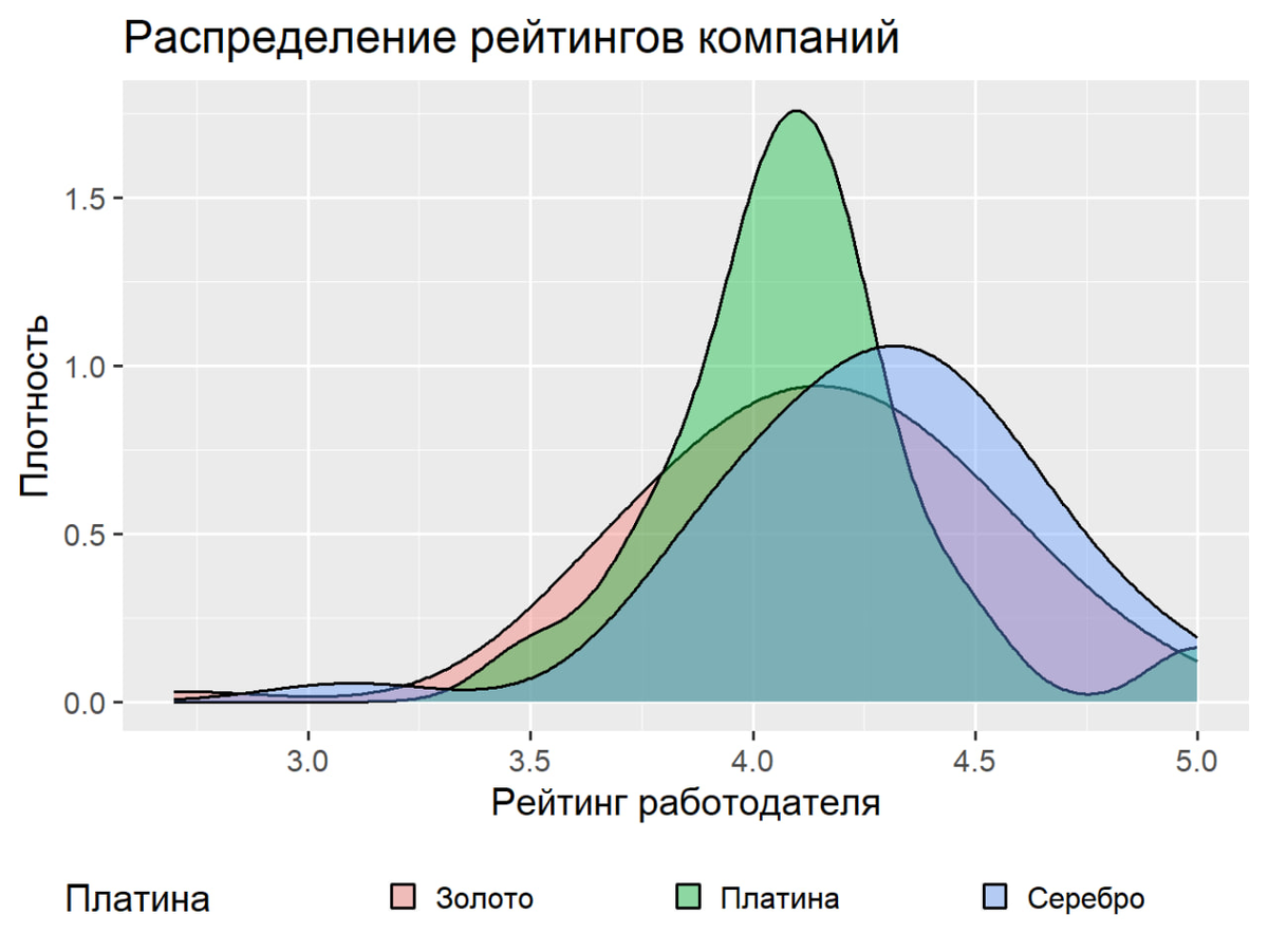 Вчера я разбирал рейтинг лучших работодателей России 2025 по версии Forbes (см. пост: ТОП лучших работодателей России 2025 от Forbes ()). Напомню, что в рейтинге нет общего рэнкинга — компании делятся на четыре дивизиона: Платина, Золото, Серебро, Бронза. Чем выше уровень — тем “лучше” компания по совокупности критериев. Я уже показывал, что размер компании имеет значение: чем крупнее бизнес, тем выше шанс попасть в «элитную» Платину (см. О рейтинге лучших работодателей Forbes ()). Но что, если сравнить экспертную оценку Forbes с тем, как сами сотрудники оценивают работодателей на hh? Я собрал данные с hh, выгрузил рейтинги компаний и сравнил их между группами Forbes. Полнота данных — около 75% (в частности, у Аэрофлота на hh просто нет отзывов). Средние значения: 🔹 Платина — 4.1 🔹 Золото — 4.1 🔹 Серебро — 4.3 А теперь самое интересное: по тесту Вилкоксона различия между «Платиной» и «Серебром» статистически значимы (p = 0.04). То есть компании из «серебряной» группы получают выш
