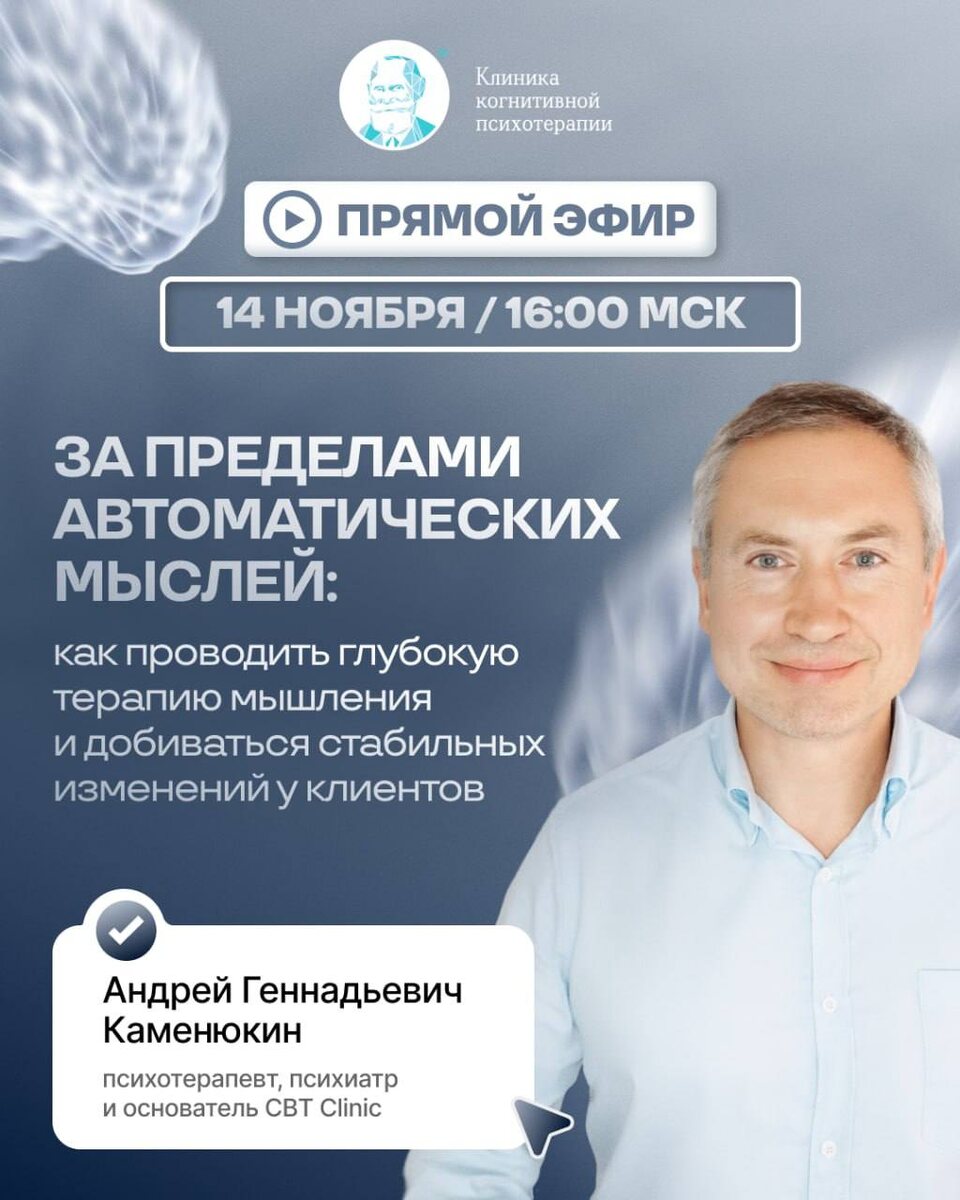 ПРЯМОЙ ЭФИР «За пределами автоматических мыслей: как проводить глубокую терапию мышления и добиваться стабильных изменений у клиентов» 14 ноября в 16:00 у нас пройдет открытый эфир с Андреем Геннадьевичем Каменюкиным — психотерапевтом, психиатром и основателем CBT Clinic ❓Мы поговорим о том, что происходит в тех случаях, когда: • Клиент всё понимает, но ничего не меняется в поведении • Сессия превращается в размышления и обсуждения без движения вперёд • Клиент рационализирует и «разговаривает о себе», не меняя внутреннюю логику восприятия То есть, о тех ситуациях, в которых терапевт делает всё корректно, но ощущается тупик Когда клиент знает, «как правильно», но снова и снова возвращается к прежним сценариям Мы разберем почему так происходит: — где именно «застревает» изменение — что такое структура мышления и как она поддерживает страдание — почему просто работа с автоматическими мыслями не даёт глубины — и что может сделать терапевт, чтобы запустить настоящий сдвиг 🧠 Этот эфир