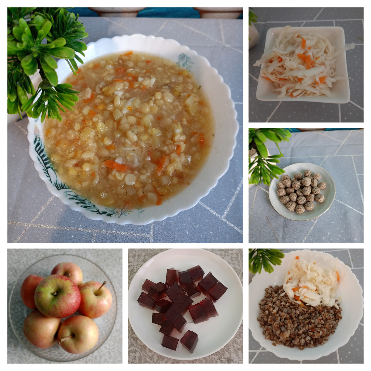 •Обед - суп гороховый на воде; капуста квашеная; ржаные отруби вместо хлеба.