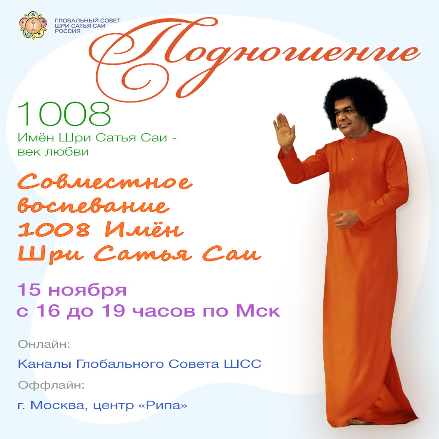 В Москве мы приглашаем всех желающих 15 ноября 2025 - уже в эту субботу - провести совместное Подношение «1008 Имён Шри Сатья Саи».
