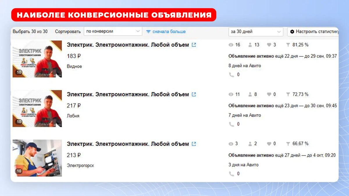 Клиент пришел с запросом получить заявки на услуги электрика, электромонтажника в Москве и МО. Ранее клиент на Авито не продвигался, был только сайт, рекламы нигде не было. 📌 Провели маркетинговый анализ, изучили методы продвижения конкурентов и спрос по городам Московской области. В нашем случае, как и в большинстве высококонкурентных ниш, вывести объявление в ТОП без платных поднятий невозможно. 📌 Изучены ключевые слова для привлечения контактов, составлен список актуальных ключевых фраз; 📌 Опубликованы два отзыва с высоким рейтингом; 📌 Оформили карточки объявлений: инфографика и текст. Тестировали и живые фотографии, и фотографии, тщательно подобранные с платных стоков. ✔️ Хочу отметить, что заказчик предоставил много качественного фотоматериала. Были использованы и фотографии специалиста, и его фотографии "до-после". ✔️ В первый месяц сотрудничества выложили 30 объявлений по Москве и Московской области в категориях - услуги: ремонт, электрика и мастер на час. ✔️ Одним из важне