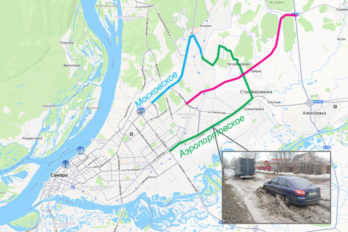 А путей в Самару у жителей «Кошелева» два – либо через ЖД-переезд и Крутые ключи на Московское шоссе (синяя линия), либо через Петра Дубраву и Стройкерамику на Аэропортовское шоссе (зелёная). И если Московское – просто ползущие в шесть рядов машины, то Аэропортовское – дорога двухполосная и лишённая даже ливневой канализации! Плюс по ней в Самару заезжают жители Кинельского, Богатовского, Кинель-Черкасского и пары других районов области, а также поток с некоторых других направлений. В общем, Аэропортовское и его напарник улица Макаренко – место совершенно непроезжее.