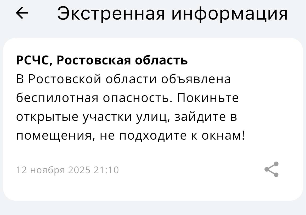 ‼️Экстренная информация РСЧС: В Ростовской области объявлена беспилотная опасность. Покиньте открытые участки улиц, зайдите в помещения, не подходите к окнам!