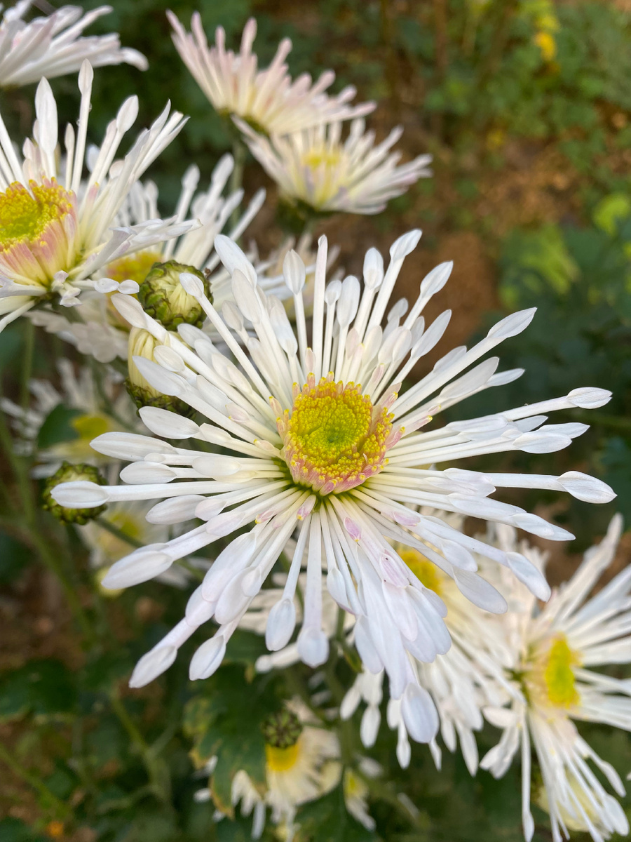 12.11.25 Эта хризантема приехала в сад с прошлогоднего бала хризантем в Никитском ботаническом саду. Так сейчас выглядит в саду. Так выглядела на выставке. А так — в магазинчике рядом с выставкой. Из каталога Никитского ботанического сада: «Хризантема сорт ‘Annesy White’. Группа мелкоцветковая. Растение высотой 100,0–120,0 см. Цветоносные побеги прочные. Соцветие бело-розовое, анемоновидное, диаметром 6,0–6,5 см. Сорт среднего срока цветения: начало цветения III декада октября. Цветение обильное и продолжительное. Рекомендуется для цветочного оформления и срезки цветов» У меня этот сорт показал себя ближе к позднецветущим, только распустились первые цветки, а на улице уже 2 декада ноября началась Считаю, что вторая запоздалая прищипка так повлияла на сдвиг во времени цветения. Первый раз прищипнула в начале мая. Второй — в конце лета. Это была незапланированная прищипка. Случайно отщипнулись нежные верхушечные центральные бутончики, когда смывала тлю на побегах хризантемы.