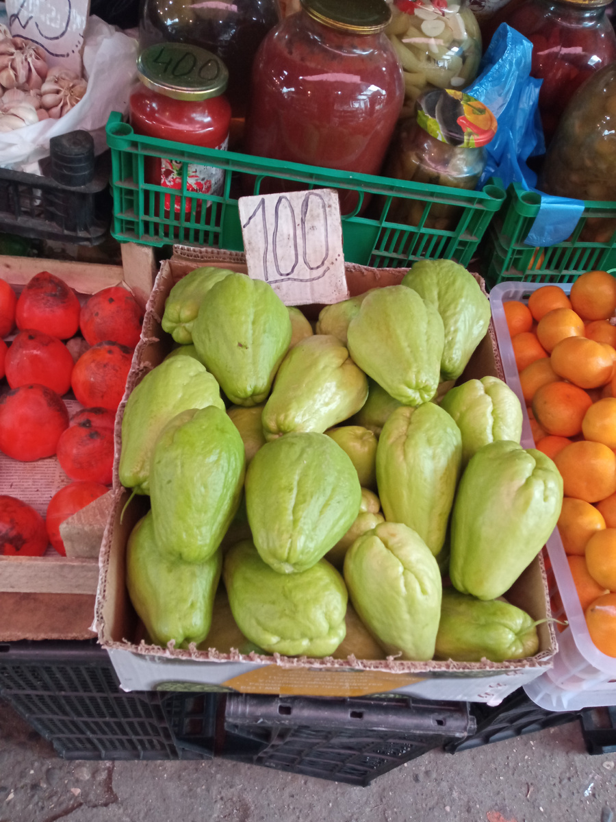 После обеда поехала на рынок. Думала, что сделаю немного фотографий , а получилось опять их много. Покажу сезонные фрукты. Начну со своей покупки. Я купила мексиканский огерец . Цена 100 рублей за 1 кг. Я купила на пробу 1 штуку. Он весит 420 грамм, заплатила за него 40 рублей. Завтра хочу его подарить. О результате кулинарного эксперимента постараюсь вам рассказать позже. Мексиканские огурцы продавались в нескольких местах. Мандарины от 50 рублей до 150 рублей . Много местных лимонов . Цены от 50 рублей (мелкие, совсем мелкие) до 100 рублей за 1 кг. Много хурмы. Цена от 50 рублей за 1 кг. Киви 🥝 Фейхоа Самая дешёвая цена за 1 кг каштана - 150 рублей . Острый перец есть свежий и есть сушенный. Кукурузы стало меньше, чем неделю назад. Цена зависит от размера початка кукурузы. Посмотрела цены на картофель. Разброс цен от 55 до 110 рублей за 1 кг. Меня очень удивила цена в 110 рублей. Лук, морковь... Малина. Свежая малина. Сказали, что местная. Цена ... 1000 рубл