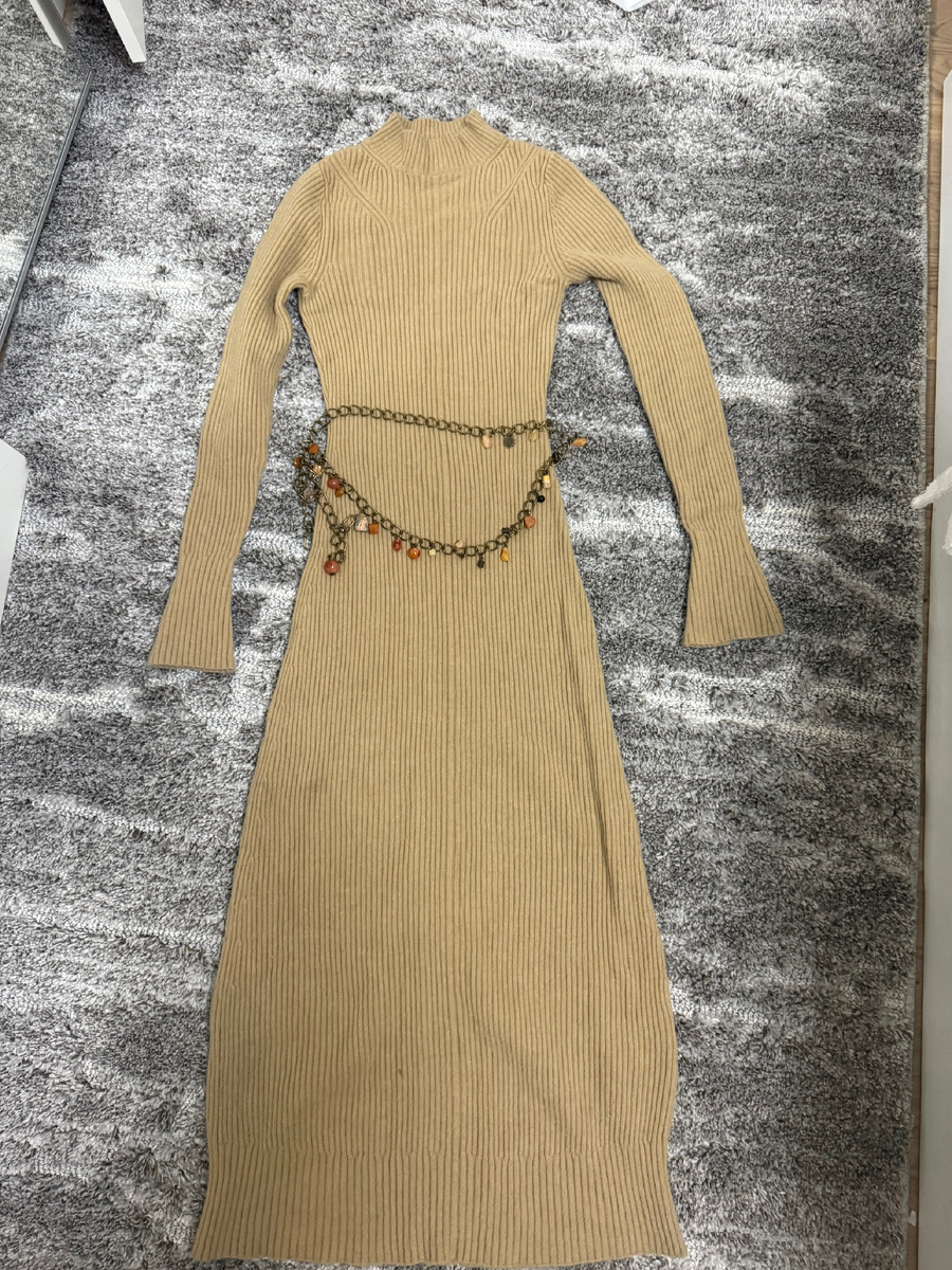 Во время своих поездок в Минск осенью я купила немало новой одежды: и теперь я придумываю способы ее стилизации. Одежда, в моем понимании, полуфабрикат, который нуждается в приправах и доработке. Перед покупкой я всегда мысленно представляю, с чем эту вещь я смогу носить, и если идей не возникает - я оставляю ее в магазине. А потом дома я проверяю правильность своего решения))) В этот раз я решила стилизовать платье бренда The other's stories... Качественный плотный трикотаж классического цвета кэмел, его можно увести и в ретро, и в классику, и в спорт. Я решила немножко поиграть в ретро, тем более, аксессуары этому способствовали))) У меня с давних времен сохранилась металлическая цепочка с подвесками из натуральных камней бронзового цвета. А несколько лет назад я купила коричневую небольшую сумку, которая тоже отсылала к элегантным образам. Вот это все я и решила объединить: Как получилось? Что скажете? А потом мне в голову пришла совсем сумасшедшая идея! Я надела цепочку на су