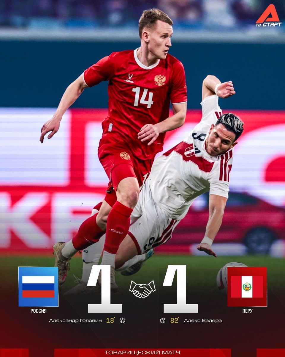 🤝😐 Валера отобрал победу у Валеры Головин открыл счет в первом тайме, но под конец встречи отменный и неожиданный для Сафонова дальний удар исполнил невольный тезка главного тренера нашей сборной – 1:1. Следующий товарищеский матч сборная России проведет 15 ноября в Сочи против сборной Чили 🗓 Подписывайся на ТВ СТАРТ в MAX📲