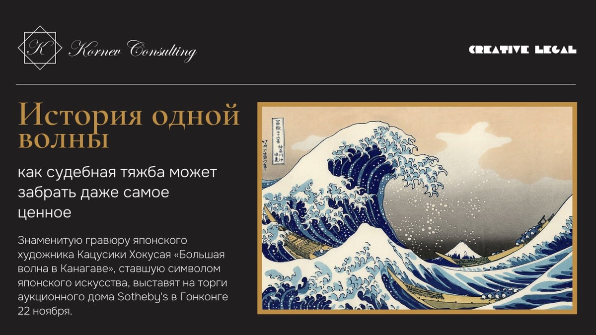 Знаменитую гравюру японского художника Кацусики Хокусая «Большая волна в Канагаве», ставшую символом японского искусства, выставят на торги аукционного дома Sotheby's в Гонконге 22 ноября. Это не просто новость из мира искусства — это настоящая драма, в которой переплелись большие деньги, дружба, ставшая враждой, и неожиданные последствия судебных споров. Гравюра станет одним из 125 лотов, которые распродает японский художественный музей Окада в регионе Хаконэ, открывшийся в 2013 году. Основатель музея, миллиардер Кадзуо Окада, пошел на этот шаг, чтобы покрыть свои долги в размере 50 млн долларов. Его многолетние юридические проблемы начались с конфликта с американским бизнесменом Стивом Винном. Когда-то они были партнерами и вместе основали игорную империю Wynn Resorts, но позже обвинили друг друга в коррупции. Судебная тяжба завершилась лишь в 2018 году, однако Окада отказался оплачивать услуги своей юридической фирмы Bartlit Beck. Суд постановил взыскать требуемую сумму за счет акти