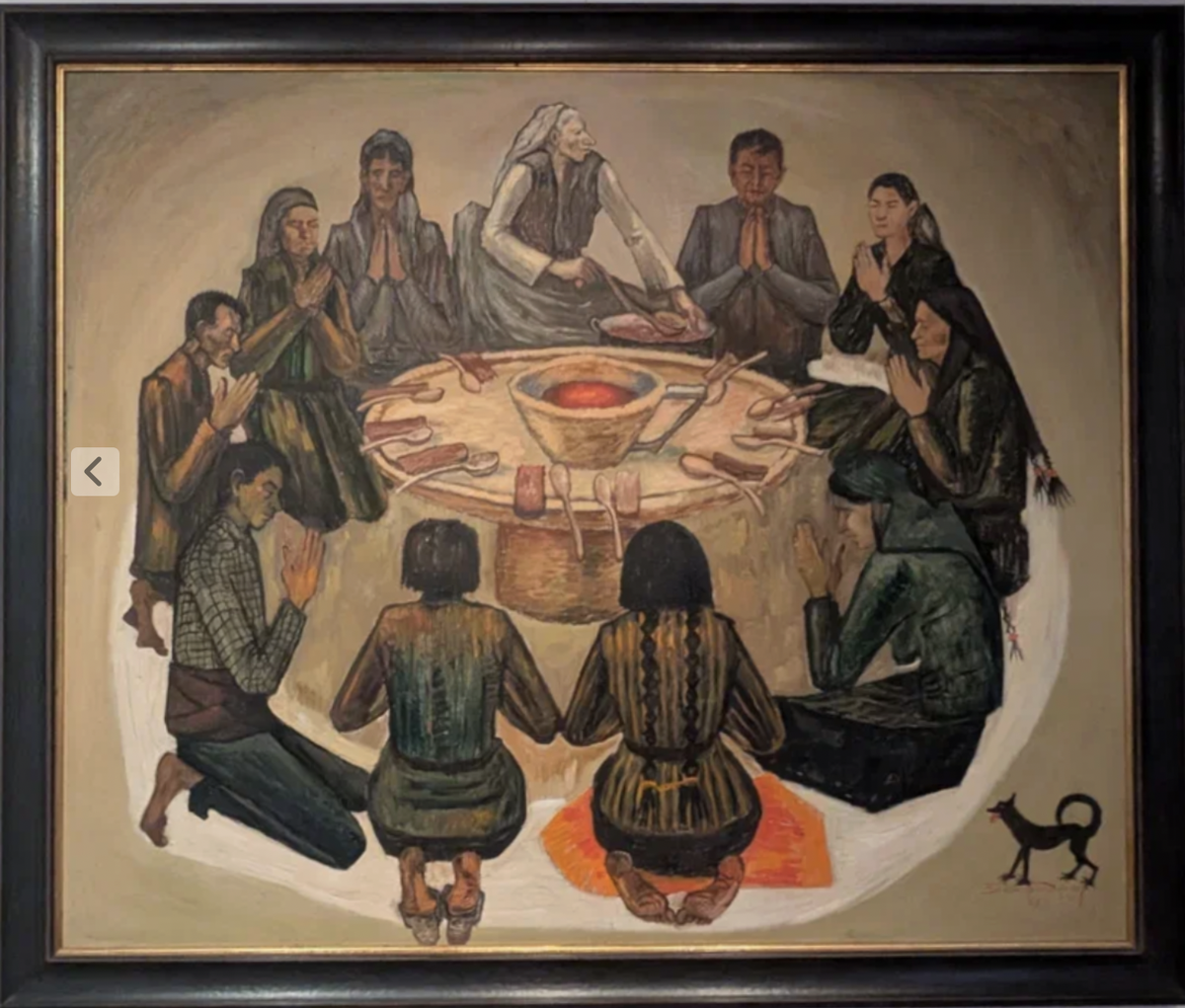 Бояджиев создаёт не просто бытовую сцену, а икону повседневности: ужин превращается в акт духовного единения, где хлеб и молитва связывают людей с землёй и с Богом.
